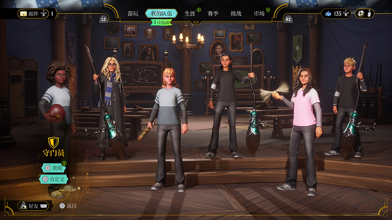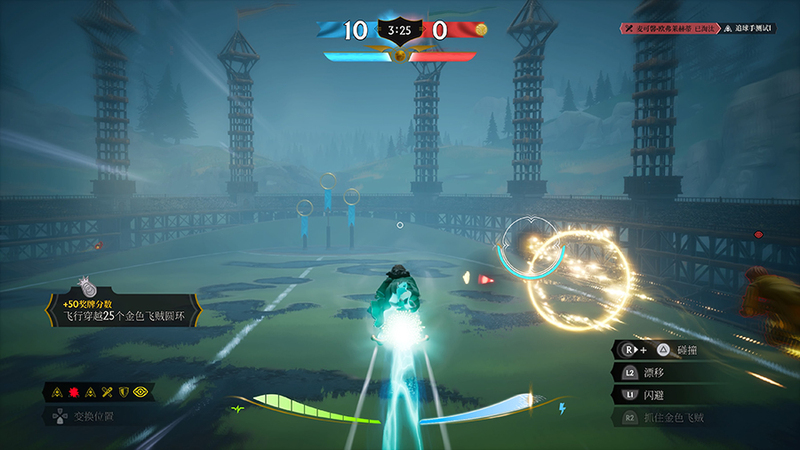 游戏中的魁地奇,比赛双方各由1名守门员、1名击球手、3名追球手,和1名找球手组成,单人游戏时你需要从6名球员之间互相切换来取胜,在线游戏时每位玩家将控制2名球员,以实际3 V 3的形式来对抗。