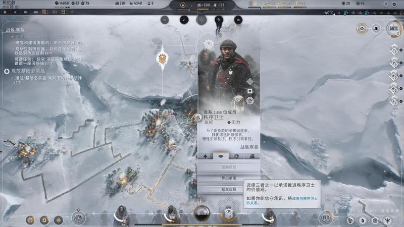 在游戏的初期阶段,其实还是以资源开发和生存建造为主要目的,这将持续游戏近一半的时间。初见的UI界面相较于1代更加简洁,上方是城市的各种资源数量,下方是人民的各种派系成员,底部中间的黑球代表城市的紧张度,天气、暴乱、卫生、法律等都会使黑球增加最终导致游戏结束。