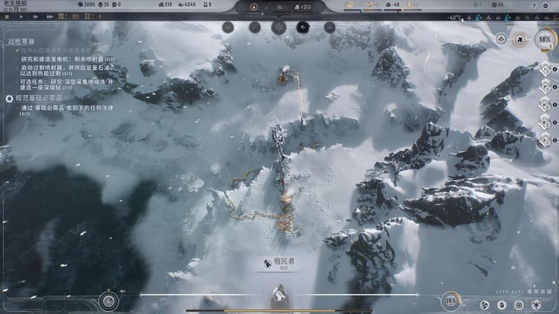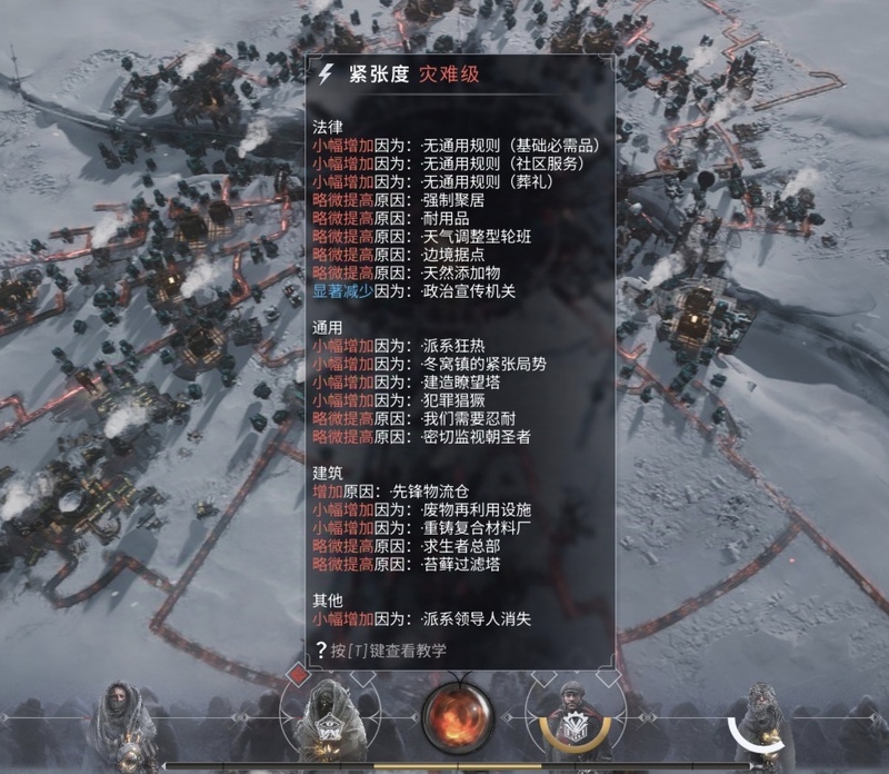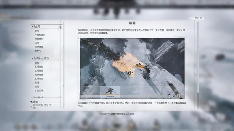 本作一开始可以预设和自定义游戏难度,维度包括经济、天气、霜地和社会。难度只能在新游戏中才能更改,强烈建议初次游玩的玩家把难度都调低,否则后期真的容易焦头烂额。序章可以看做是游戏的基本教程,但指引效果不算太好。所有的教程都集中在一个面板中按T可以呼出,未来所有涌现出来的词汇和机制都在这里进行介绍,这就导致流程中没有一个循序渐进的引导过程。因此一般情况下是给你设定一个目标,教程面板中出现相关词条,自己再去查看研究怎么操作,缺少过程的交互。作为一款城市建造资源管理游戏,各种机制和词条本身具有一定的上手门槛,而新手教程的指引就是能不能把玩家代入门槛的关键。唯一方便的就是你遇到不熟悉和不理解的词条和机制,可以直接跳转到教程面板的相关描述,不用自己去手动查找。