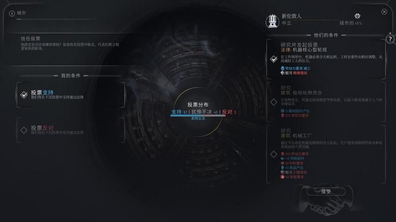 所以在游戏的过程中,很多时候的决策都是身不由己的,这个时间段想去研究机器搞发展,结果之前承诺了某个派系,结果只能去听他的去研究个现阶段用不上的装置。有时候想赶紧颁发个法律解决一下城市的犯罪问题,结果之前已经答应某个派系这个提案要由他们来完成。诸如此类的推来推去,城市的发展总是在我的计划之外。最重要的是,你在采取一系列措施讨好某个派系的同时,必然会伤害到另一个派系的利益,就想游戏里说的那样,虽然人民需要一个值得期待的未来,但每个人想要的未来完全不一样。为了哄好这些刁民,你不得不在几个派系之中来回周旋,以求一个较为稳定的城市发展。
