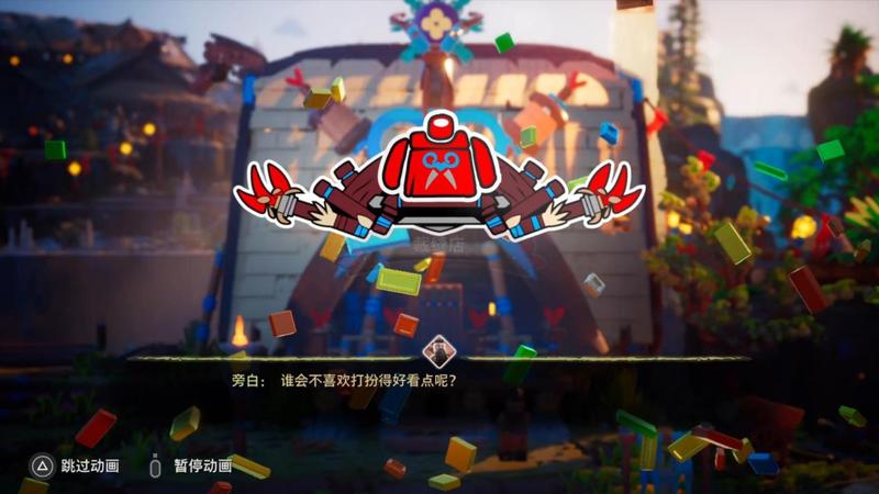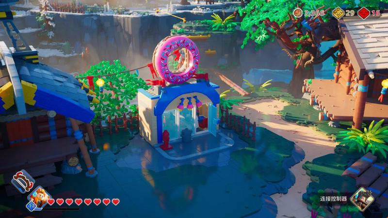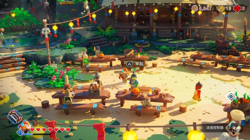 不过基地的确是非常热闹,有NPC在DJ的舞台开party,有的到处乱串,有的在岸边钓鱼,你还可以把他们举起来丢出去,这个感觉比较类似前段时间的《宇宙机器人》。但《乐高地平线大冒险》的建筑更多样,动态元素也很多,所以四处转一转也比较有意思。