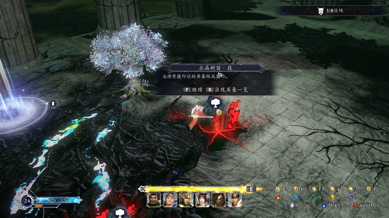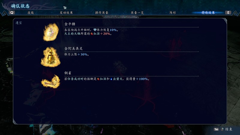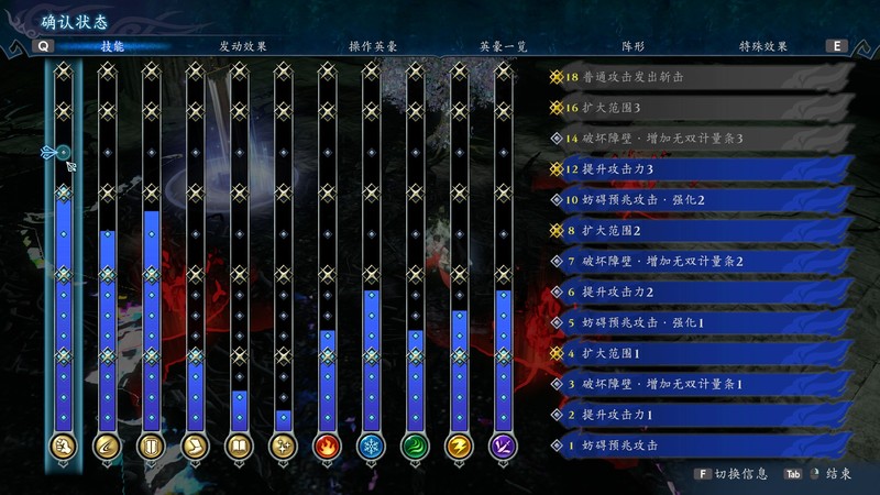 HP的上限需要通过进入桃树楼层获得加成,阵型需要通过进入大锅楼层花费敌人掉落的红泪购买。各项属性包括力、技、坚、速、智、魅六维,与斩、火、冰、雷、风五种特效,通过武将盟约与掉落的宝珠可以累积这些属性,属性基本上只影响数值的高低。