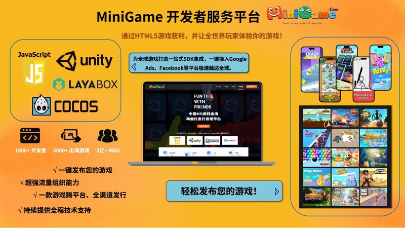 MiniGame 还自主研发了MiniGame Cloud开发者平台,面向全球游戏开发者,提供强大的SDK服务与全程技术支持,助力游戏高效接入与全球发行,专注于H5游戏全球发行,致力于为用户提供优质、有趣的游戏体验。游戏类别包括IAA、IAP、小程序游戏、PVP等,玩法从超休闲到中重度均有涉及。