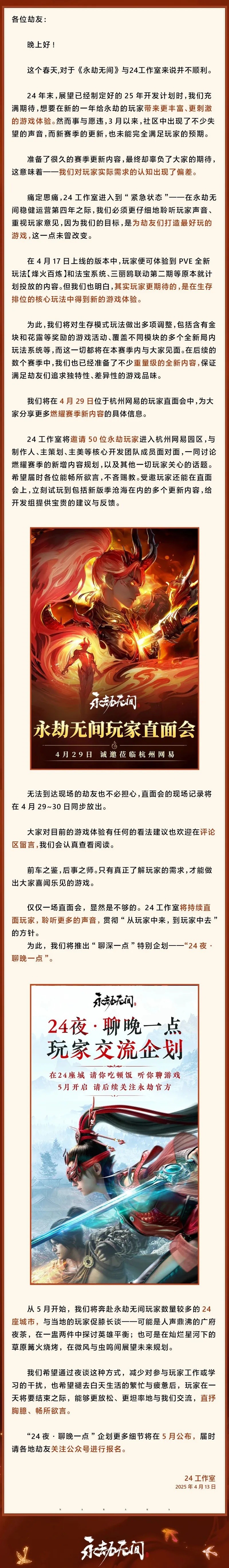 13日晚间,网易游戏《永劫无间》通过官方公众号发布道歉信,承认从今年3月以来对玩家需求的认知出现偏差,从BUG频发到新赛季体验较差,游戏近段时间以来的更新大都未能满足玩家预期。