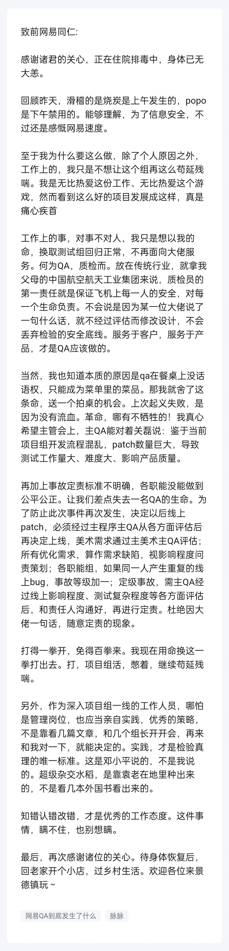 玩家因此集体投诉后,网易管理层倒查责任,认定该QA人员“风险评估失误”,在连续三天问责会议后,该员工收到绩效降级通知。从而导致该员工做出此极端举动,好在事后该员工被即时送往医院排毒,经过救治后身体已无大碍。