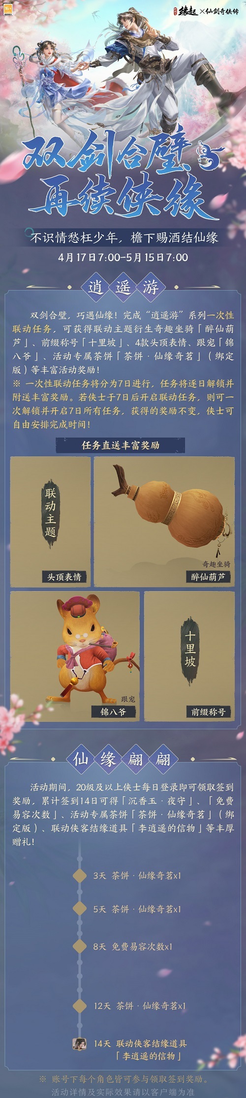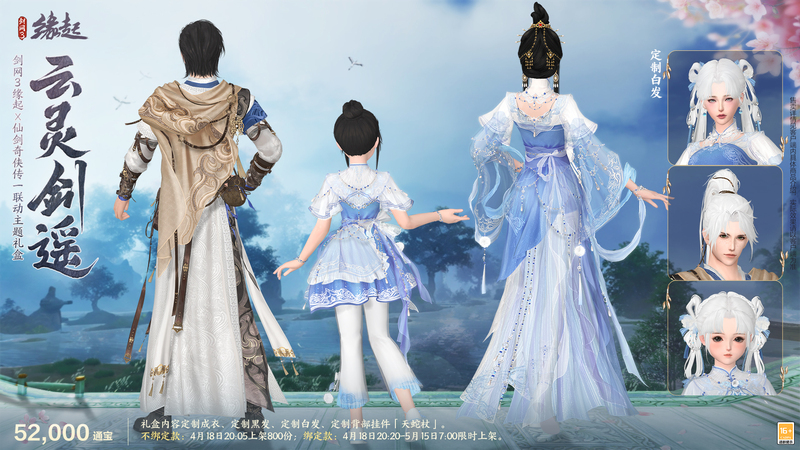 永忆江湖初相逢,《剑网3缘起》×《仙剑奇侠传一》联动主题外装礼盒“云灵剑遥”从李逍遥和赵灵儿的经典形象出发,在保留原角色风采特点的同时进行衍生创作,更显侠士潇洒风流!