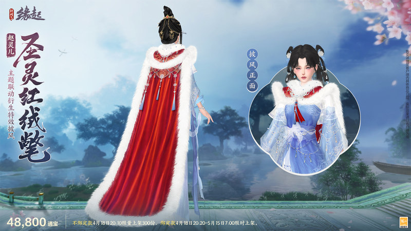 垂云拥深雪,牵星伴月眠,《剑网3缘起》×《仙剑奇侠传一》联动衍生特效披风“圣灵红绒氅”神秘登场,联动特别款售价48,800通宝!似雪软毛围边,朱红微光长缎,宝珠系缠流苏银饰,点亮如火丝绒,雍容大气!
