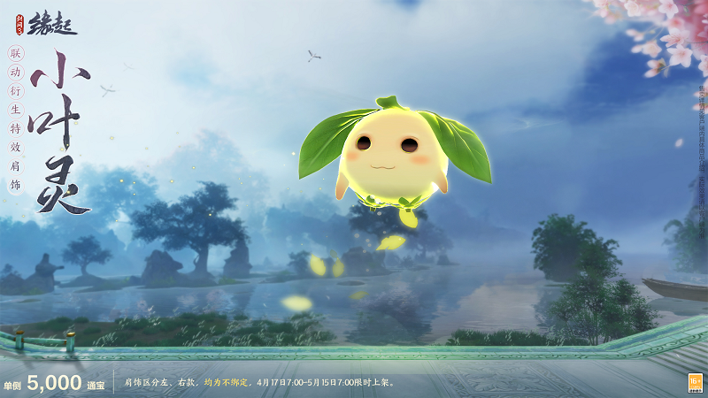 天灵灵,地灵灵,叶灵一直陪伴您!全新联动衍生特效肩饰“小叶灵”萌趣登场,圆润可人的叶灵将在你的肩侧蹦蹦跳跳,嫩叶与晶莹粒子不时绽出,荡起层层涟漪,带来别样可爱!